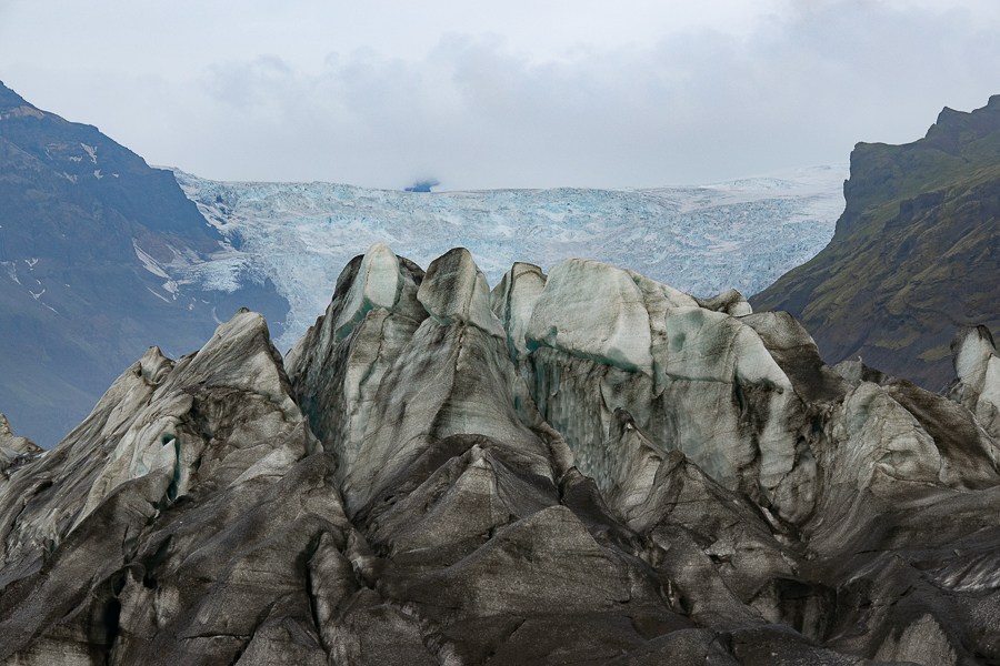 Svínafellsjökull también se caracteriza por su gran entramado de grietas que se abren a lo largo de la lengua glaciar, así como por las aristas y formas afiladas que adoptan los hielos situados al pie de la gran masa helada.